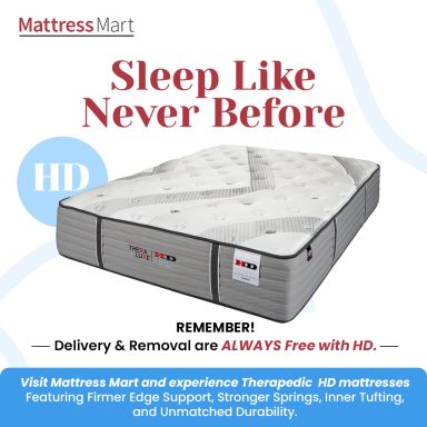 For over three decades, Mattress Mart has proudly carried Therapedic brand mattresses. Known for innovation, Therapedic produces the TheraLuxe HD collection, an ultra-durable line designed to provide lasting support for those seeking heavy-duty, premium-quality mattresses. As a trusted brand in our lineup, Therapedic aligns with our commitment to deliver long-lasting quality and exceptional comfort to every customer.