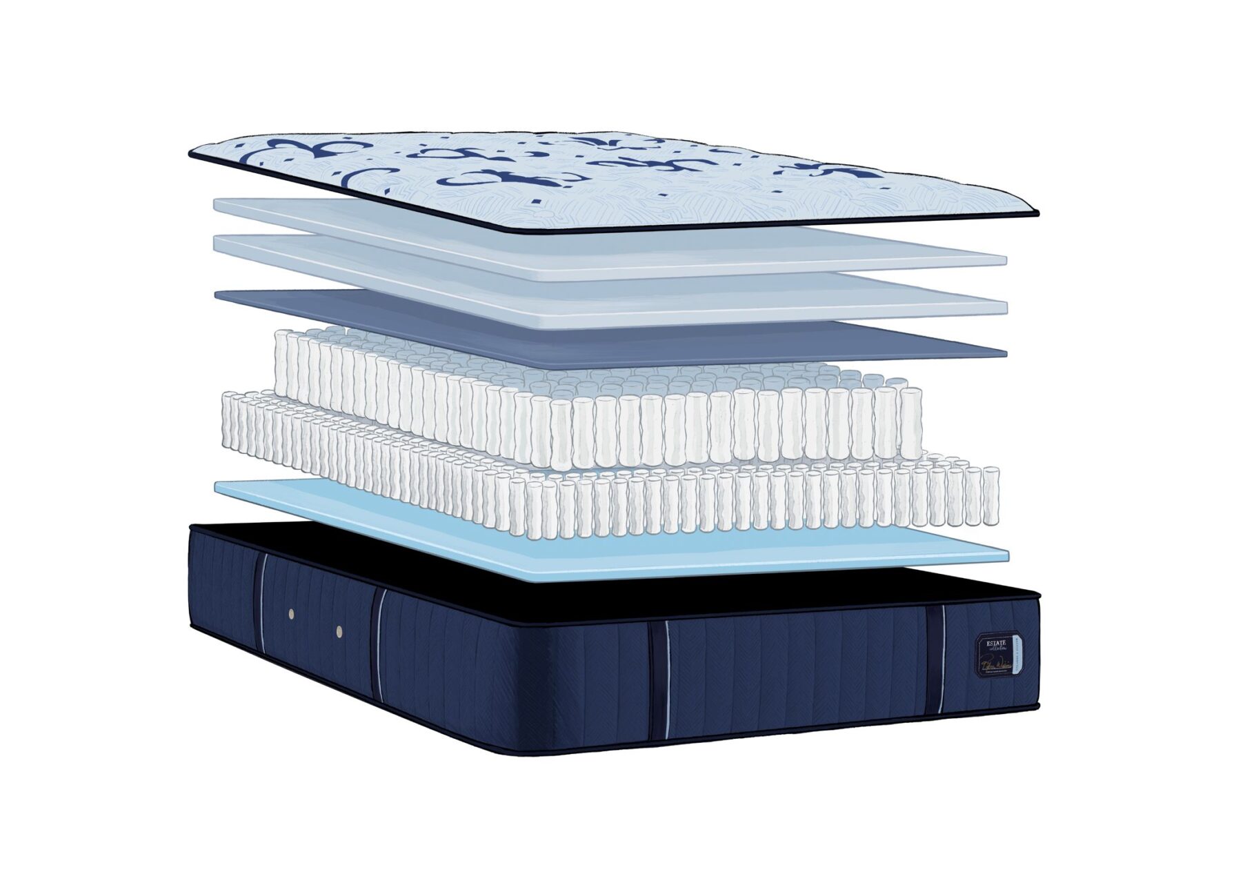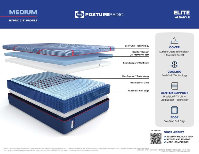 The Albany Medium in the Posturepedic Elite Hybrid line is where we usually start when someone wants a noticeable cushion on top, but still a true “medium” feel under their back. It uses the same zoned, individually wrapped coil system as the other Elite hybrids, paired with a slightly firmer blend of memory and gel foams than the plush models, so your shoulders and hips can ease in without that stuck or sagging feeling. This one tends to work well for most back and side sleepers, couples with slightly different preferences, and anyone who likes to sleep a bit more “in” the mattress than a firm model but nowhere near as soft as a big pillowtop, with the cool-to-the-touch cover helping keep heat build-up in check.