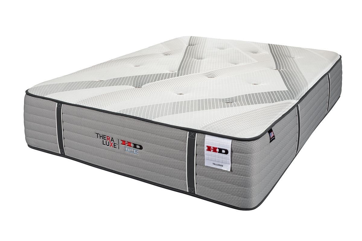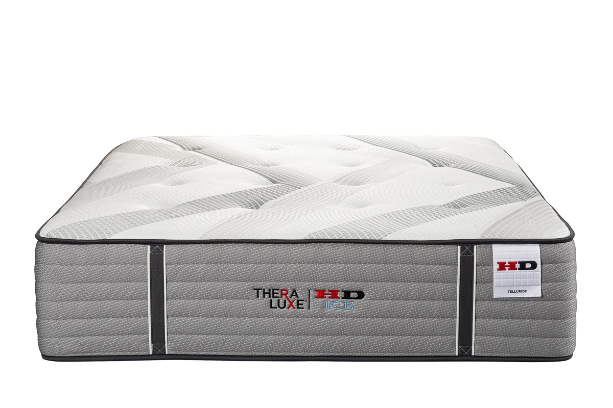 The TheraLuxe HD ICE Telluride is a true hybrid in the HD ICE family—designed for people who like the slow-melting hug of memory foam but don’t want to feel stuck in the bed or overheated. A thick copper-infused memory foam layer, plush HypurGel® foam, NanoCoil® micro-coils, and a firm layer of organic Dunlop latex sit on top of the same heavy-duty QLX® HD pocketed coil unit used throughout the collection. The result is a plush-to-ultra-plush feel with deep contouring, extra airflow, strong edge support, and the kind of durability you buy HD for in the first place.